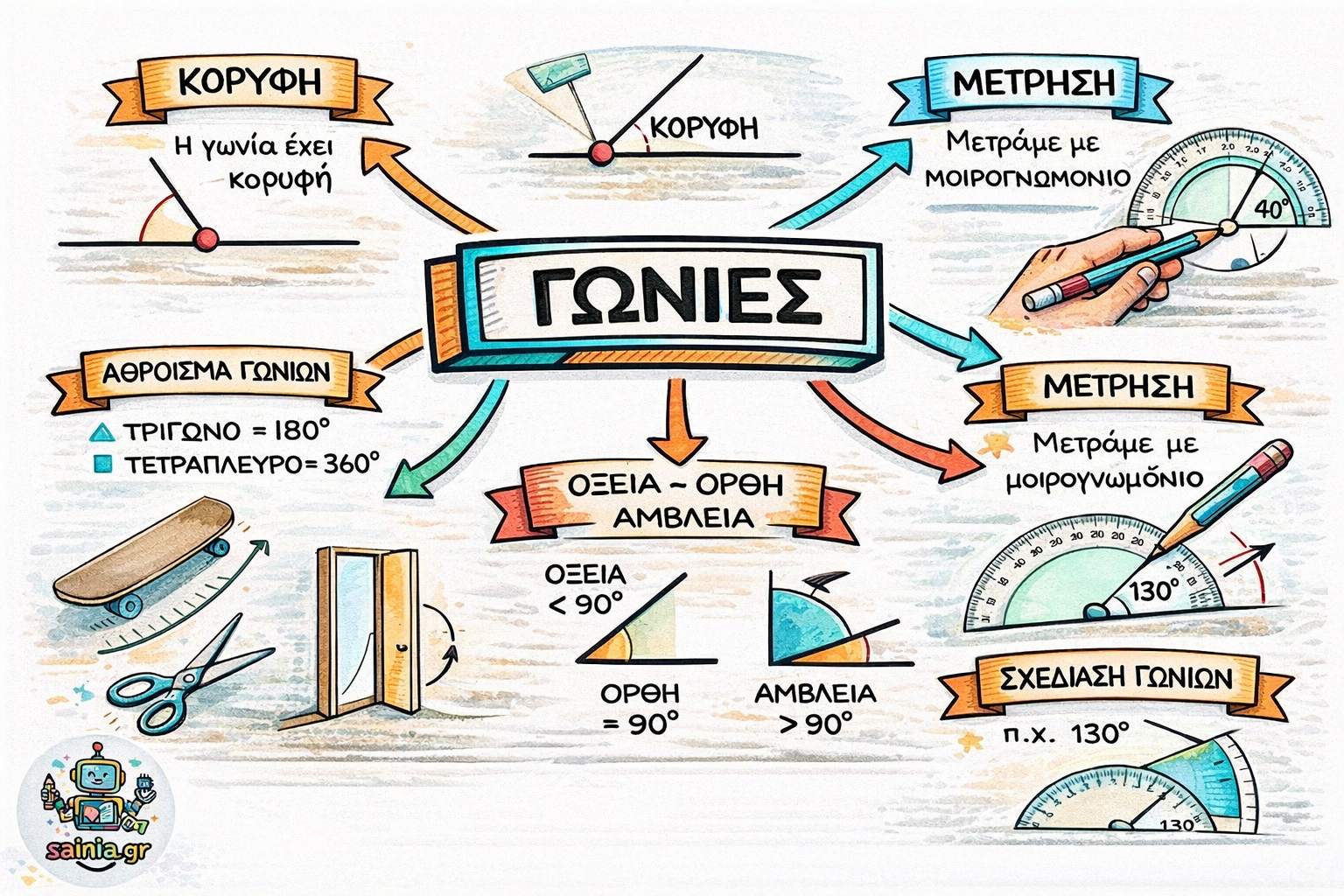 Το μέγεθος των γωνιών το μετρούμε με τις μοίρες. Οι γωνίες που είναι μικρότερες από 900 λέγονται οξείες. Οι γωνίες που είναι 900 λέγονται ορθές. Οι γωνίες που είναι μεγαλύτερες από 900 λέγονται αμβλείες. Στις αμβλείες γωνίες ξεχωριστό όνομα έχουν ευθείες γωνίες (1800) και οι πλήρεις γωνίες (3600).