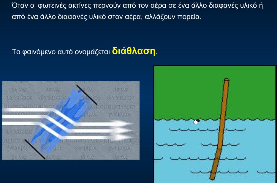 Όμοια, ένα αντικείμενο που βρίσκεται μέσα στο νερό φαίνεται πιο κοντά απ' ό,τι είναι στην πραγματικότητα.