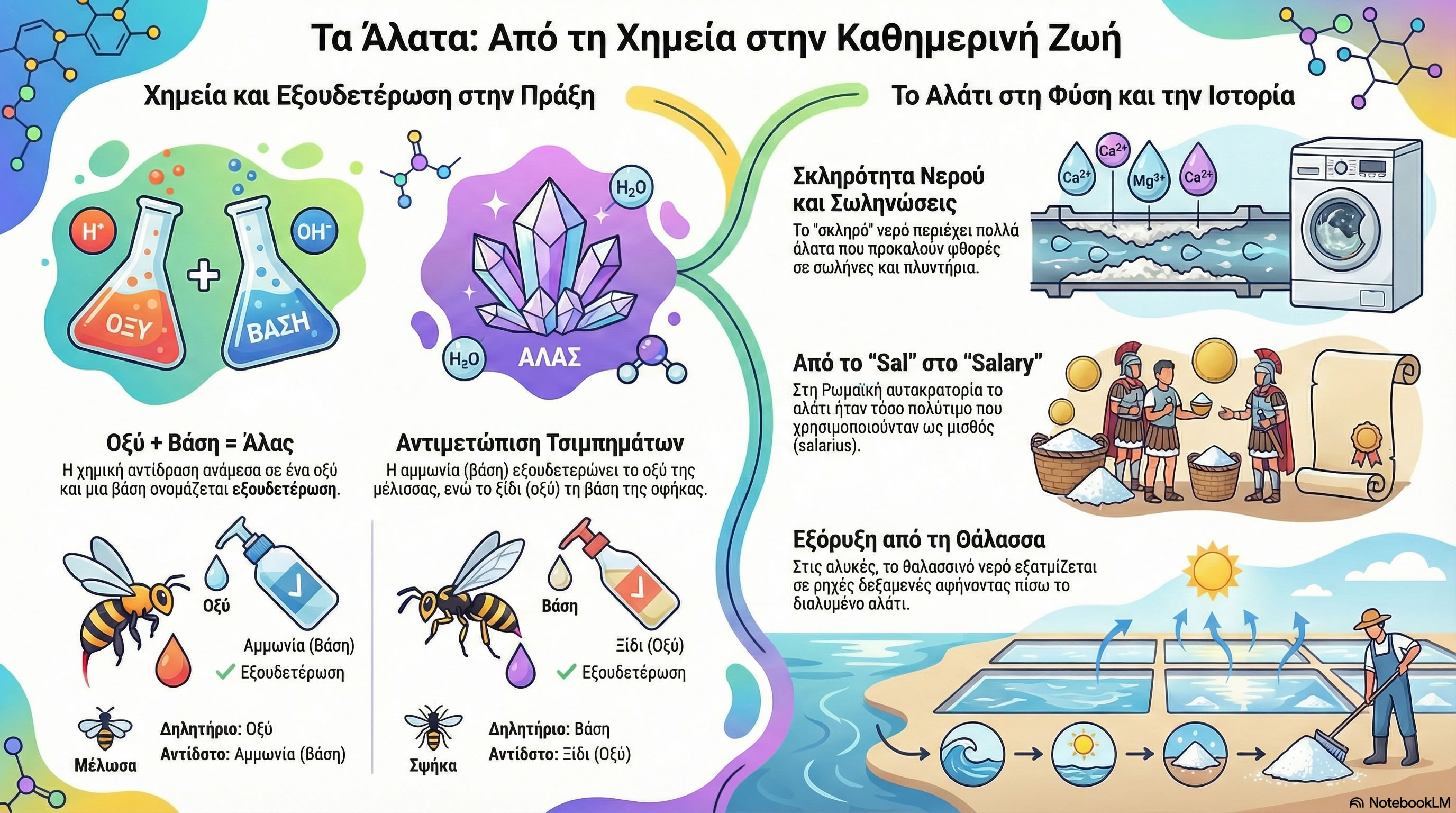 Το αλάτι είναι μια ουσία που χρησιμοποιούμε καθημερινά. Το αλάτι δε νοστιμίζει απλά τα φαγητά, αλλά είναι απαραίτητο για τη γεύση και για την καλή λειτουργία του νευρικού συστήματος. Το αλάτι χρησιμοποιείται επίσης ως συντηρητικό τροφίμων. Κρέας, ψάρια και ελιές διατηρούνται με αλάτι. Αυτή του η ιδιότητα έκανε το αλάτι ήταν πολύτιμο πριν από την ανακάλυψη των ψυγείων, τόσο πολύ που πολλές φορές χρησιμοποιήθηκε ως νόμισμα. Στη Ρωμαϊκή αυτοκρατορία, για παράδειγμα, οι στρατιώτες, οι λεγεωνάριοι, πληρώνονταν με «πολύτιμο» μαγειρικό αλάτι. Από τη λατινική ονομασία του αλατιού, sal, η αμοιβή αυτή ονομάστηκε salarius, λέξη από την οποία προέκυψε στη αγγλική γλώσσα το salary, που σημαίνει μισθός, και το ρήμα sale, που σημαίνει πουλώ.